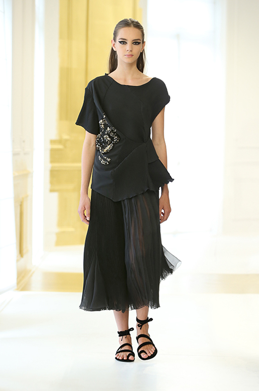 Indeed it is the Bar’s structure that is also reinterpreted. Meier and Ruffieux began with the skirt, experimenting with pleating and draping in the evening dresses and long skirts. Their linings, layers of organza to add body, become garments in their own right, like X-rays of archive garments. The New Look’s volumes are made lighter, more contemporary: it is the spirit of the atelier flou fulfilled by the atelier tailleur. The jacket itself is deconstructed, either elongated at the basque, or drawn in vertically and gathered, adding animation and movement, a new look, a Dior spirit.