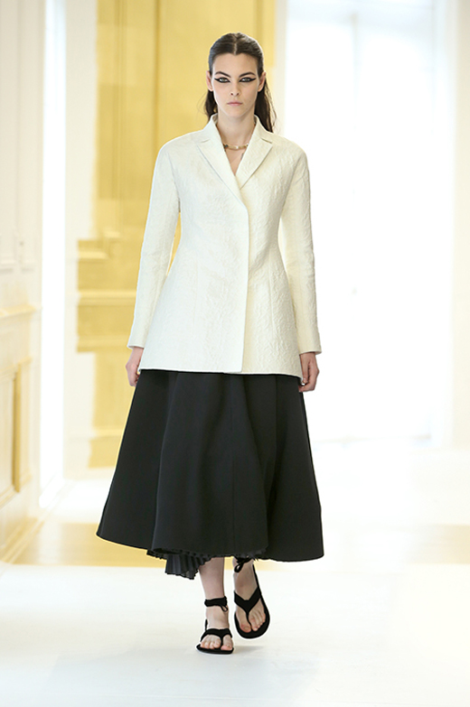 The Bar suit, the essence of Dior, is the principal inspiration. Like the beating of a heart, it punctuates the entire collection. But the inspiration goes beyond form, the signature silhouette of hourglass jacket and full skirt, encompassing every aspect of the Bar. Thus the entire collection is in the original palette, brilliantly contrasting black and white.